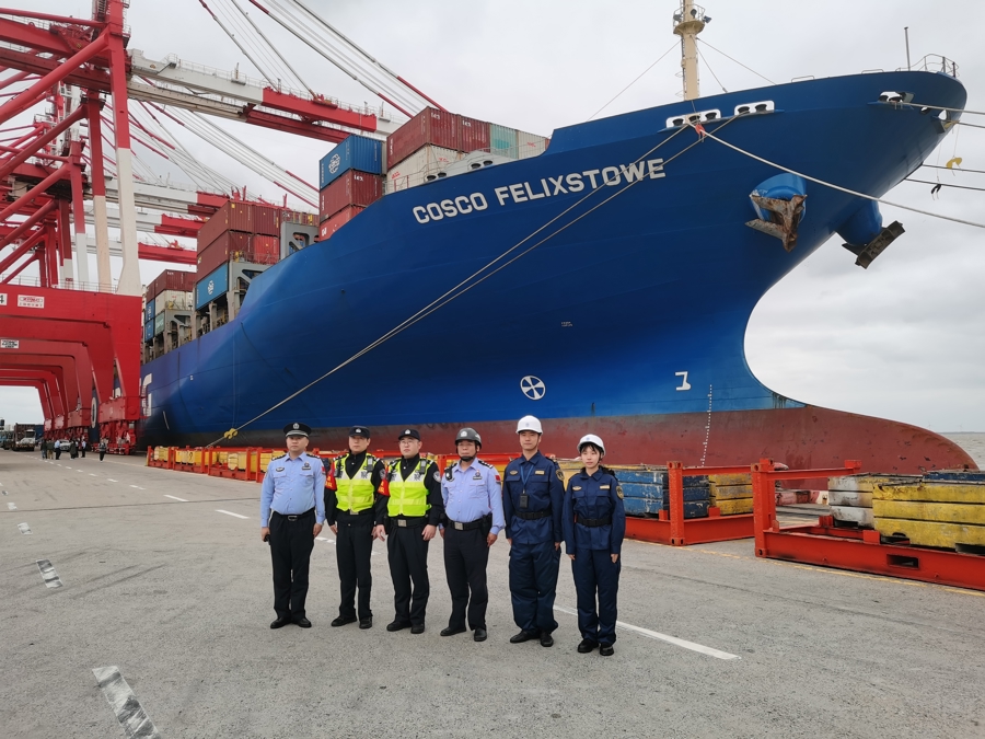 10月21日11时30分,载运着第八届中国国际进口博览会新西兰特色乳制品及手工艺品的“中远费力克斯托”轮安全靠泊在外高桥二期码头。此时,浦东海事局与外高桥边检站的执法人员已早早等候在泊位,做好了联合开展登临检查的各项准备工作,确保了展品顺利入境并转入后续的运输程序。